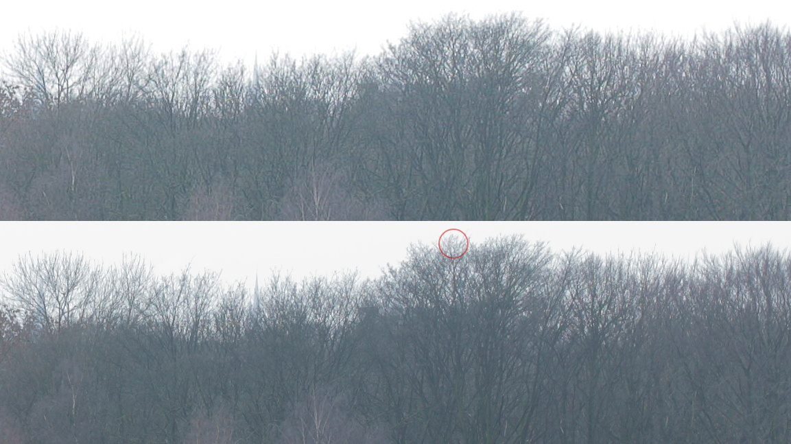 New: Added an even more obvious example. Apart from the general softness, additional detail is smeared or dropped under certain circumstances, see red circle and area to its right (this isn't dirt on your screen - some branches are interrupted near the top). Also note the church spire's missing peak.